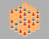 RULES: Starting with Red, each player moves one of her pieces one cell directly forwards or diagonally forwards to an unoccupied cell (no captures). The first player to have no available moves at the beginning of her turn wins the game.